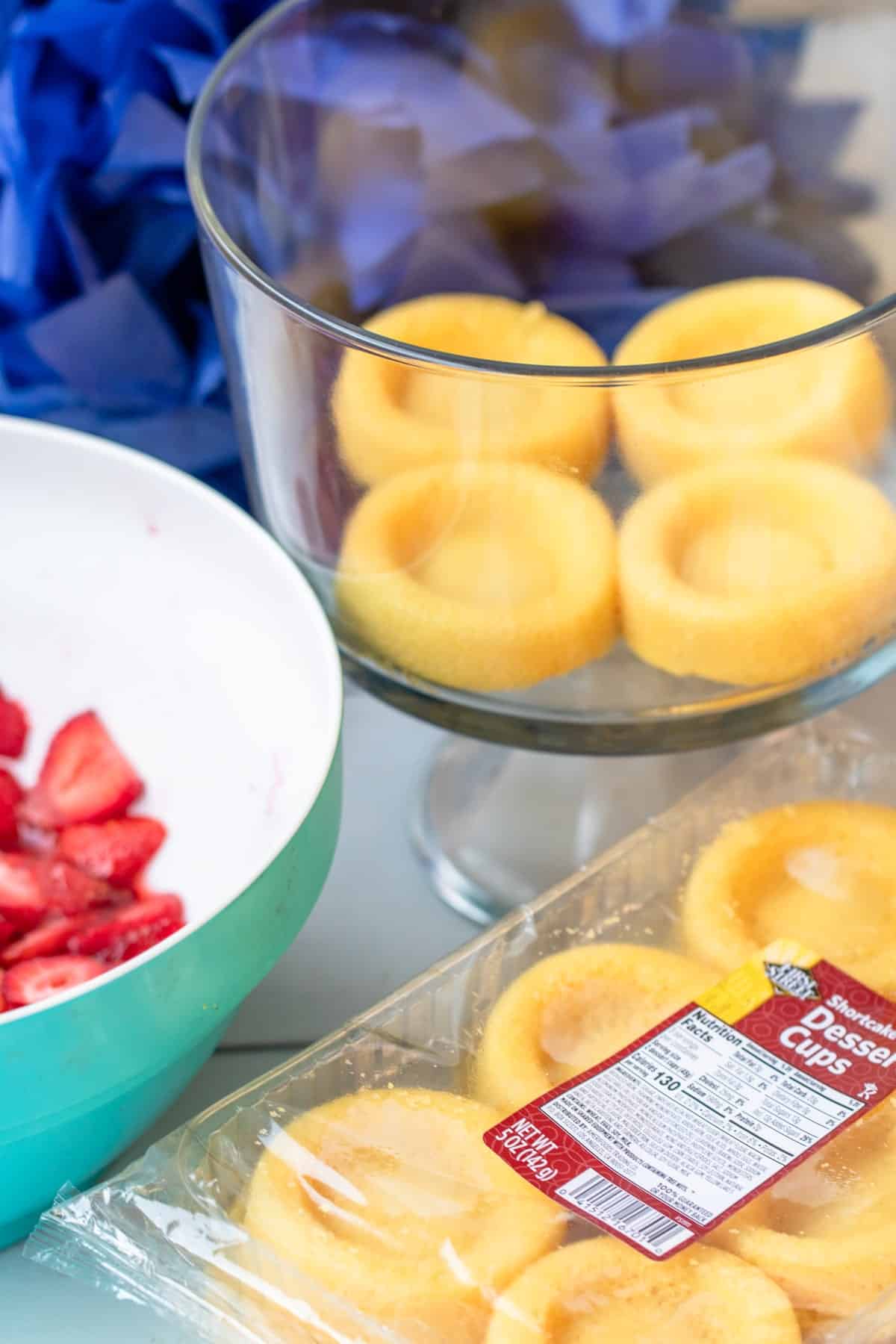 - Assemble ingredients in a trifle dish layering shortcake, macerated strawberries, pudding, Cool-Whip, and then repeat (as needed)
